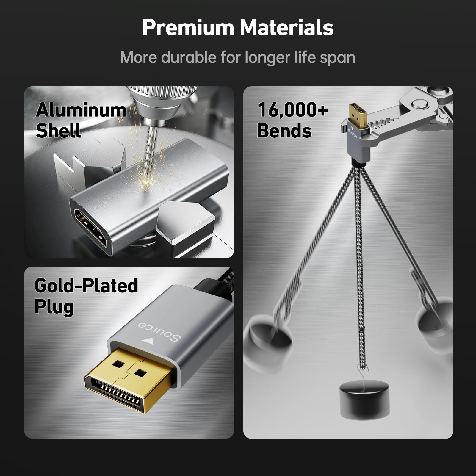 - Stabilität – der integrierte fortschrittliche IC-Chip sorgt für Signalstabilität ohne Flackern oder Bildschirmverzögerung. Der vergoldete DisplayPort-Anschluss widersteht Korrosion und Abrieb und verbessert die Signalübertragungsleistung; die geformte Zugentlastung erhöht die Kabelhaltbarkeit.